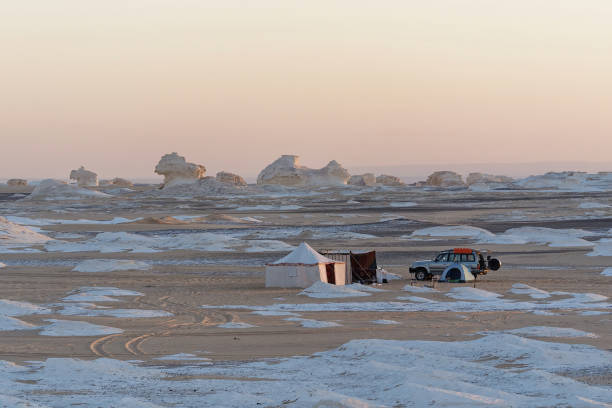 Après le petit-déjeuner à votre hôtel au Caire, départ vers l’Oasis de Bahariya (environ 340 km). Après environ quatre heures de route, début de l’aventure en Jeep 4x4 vers le Désert Noir, situé à 25 km au sud de l’oasis. Le Désert Noir est une vaste étendue de collines et de dunes volcaniques sombres, offrant un panorama unique aux allures lunaires. Pause déjeuner à l’oasis d’El Haize, avec la possibilité de se baigner dans une source naturelle d’eau chaude. Poursuite du trajet en direction du Désert Blanc (à environ 80 km après El Haize). En chemin, découverte de : La Montagne de Cristal : l’une des merveilles du désert égyptien. Formée de roches arquées striées de quartz et de parois scintillantes en cristaux de calcite, elle offre un spectacle éblouissant lorsque les rayons du soleil frappent ses cristaux translucides ou d’un blanc laiteux. La région d’Aqaba : un paysage saisissant, véritable amphithéâtre naturel encadré de montagnes, où l’on peut admirer les célèbres « fleurs du désert » : de petites pierres noires en pyrite, façonnées par le vent et le sable, prenant la forme de délicates fleurs. Arrivée au Désert Blanc en fin d’après-midi. Ce lieu unique au monde était recouvert par la mer il y a des millions d’années. Aujourd’hui, il est constitué de formations calcaires modelées par l’érosion éolienne, formant d’étonnantes sculptures naturelles d’un blanc éclatant : champignons, pyramides, sphinx, tours et autres formes fantaisistes. Installation du bivouac au cœur de ce décor féerique pour admirer un somptueux coucher du soleil : un paysage lunaire où des milliers de collines immaculées semblent flotter sur une mer de sable, dans une symphonie de couleurs naturelles allant du rose au mauve. Dîner barbecue autour du feu et nuit magique à la belle étoile.